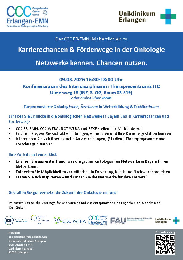 Am 9. März 2026 lud das CCC Erlangen-EMN zur Veranstaltung „Karrierechancen & Förderwege in der Onkologie – Netzwerke kennen. Chancen nutzen.“ in das Interdisziplinäre Therapiecentrum (ITC) in Erlangen ein. Zahlreiche interessierte promovierte Onkologinnen, Ärztinnen in Weiterbildung sowie Fachärztinnen nahmen vor Ort und online teil, um sich über Karrierewege und Fördermöglichkeiten in der onkologischen Forschung und Versorgung zu informieren.